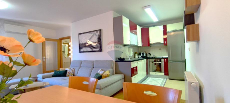 Potpuno je namješten i opremljen vrhunskim uređajima: Miele perilica rublja i sušilica, visokokvalitetna Gorenje pećnica i perilica posuđa, Zepter posuđe te sav potreban kuhinjski pribor. U stanu su i svi dodatni električni uređaji kao što su mikser, blender, aparat za kavu i sl.