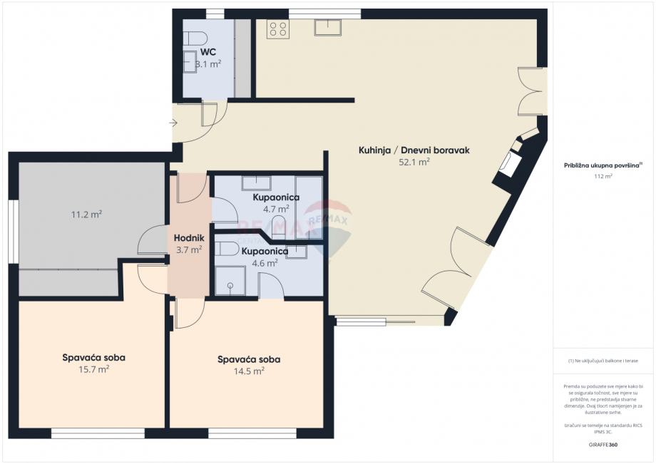 Predmetni stan sastoji se od ulaznog hodnika, dnevnog boravka s kuhinjom i blagovaonicom (open space) koja ima izlaz na balkon, tri spavaće sobe i tri kupaonice.