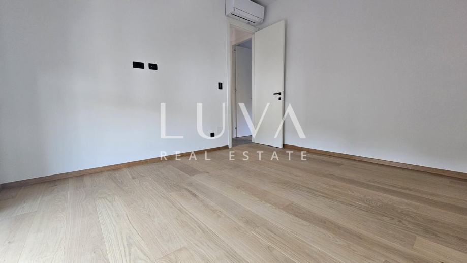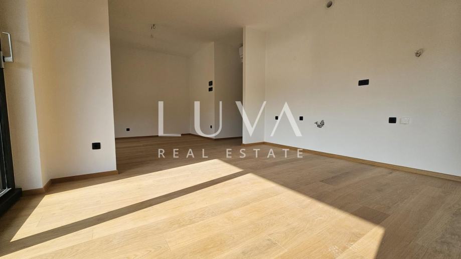 Nalazi se na prvom katu novoizgrađene zgrade, a sastoji se od dnevnog boravka s kuhinjom i blagovaonicom, dvije spavaće sobe, kupaonice, loggie, degažmana i ulaznog hodnika.