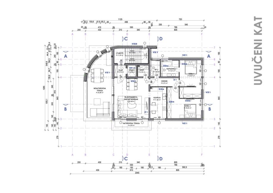 Stan se nalazi u novoizgrađenoj luksuznoj manjoj stambenoj zgradi, sa sveukupno tri stambene jedinice od kojih se svaka proteže preko cijele etaže. Sastoji se od velikog prostranog dnevnog boravka sa izlazom na vanjsku terasu, kuhinje sa blagovaonicom, dvije spavaće sobe, dvije kupaonice, gostinjskog toaleta, a sveukupne stambene površine od 115m2, a korisne 145m2.