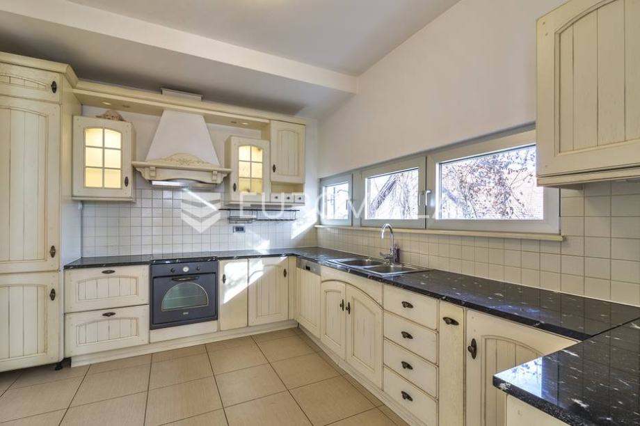 Na prvom katu urbane vile s ukupno tri stana nalazi se jedinstveni, potpuno opremljen stan površine 170 m². Prostrani ulazni hodnik vodi u impozantan dnevni boravak s izlazom na veliku terasu, a tu su i blagovaonica i kuhinja otvorenog koncepta, gostinjski toalet, vešeraj, dvije moderne...