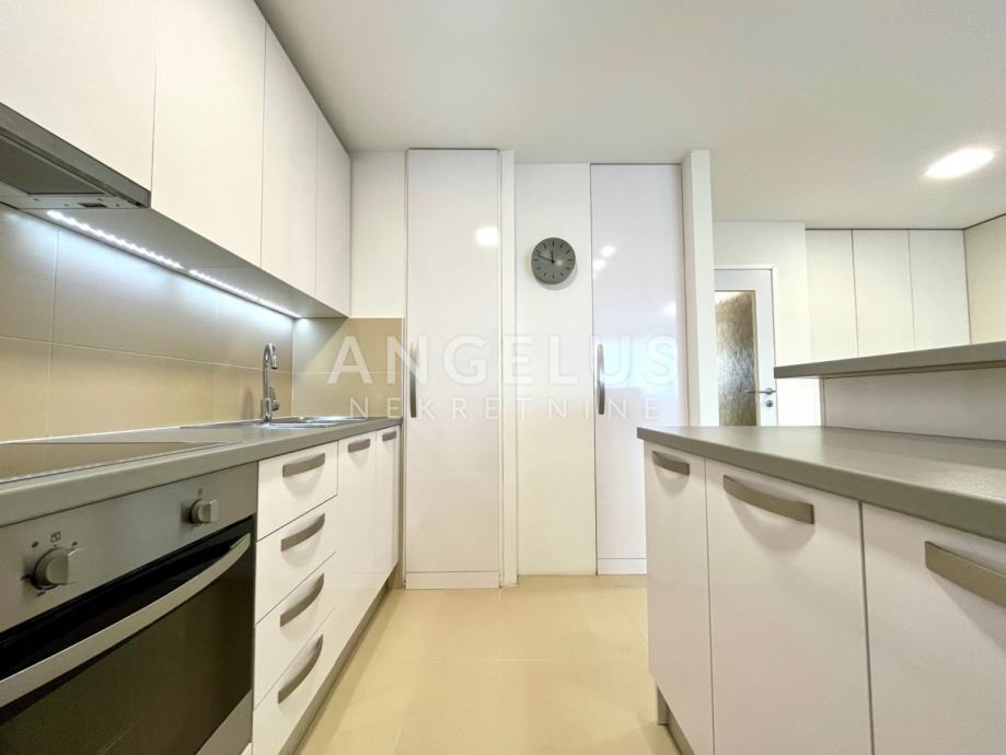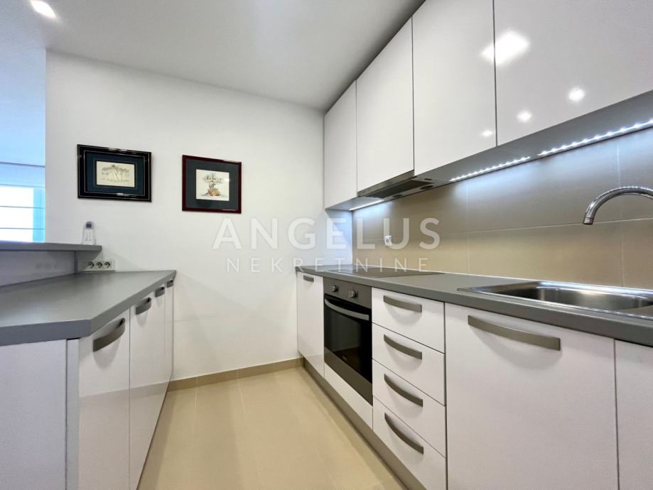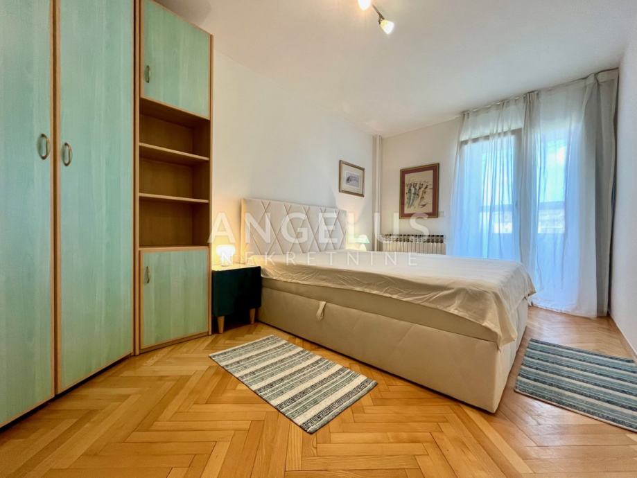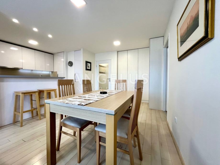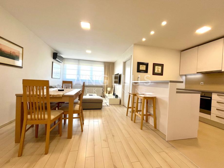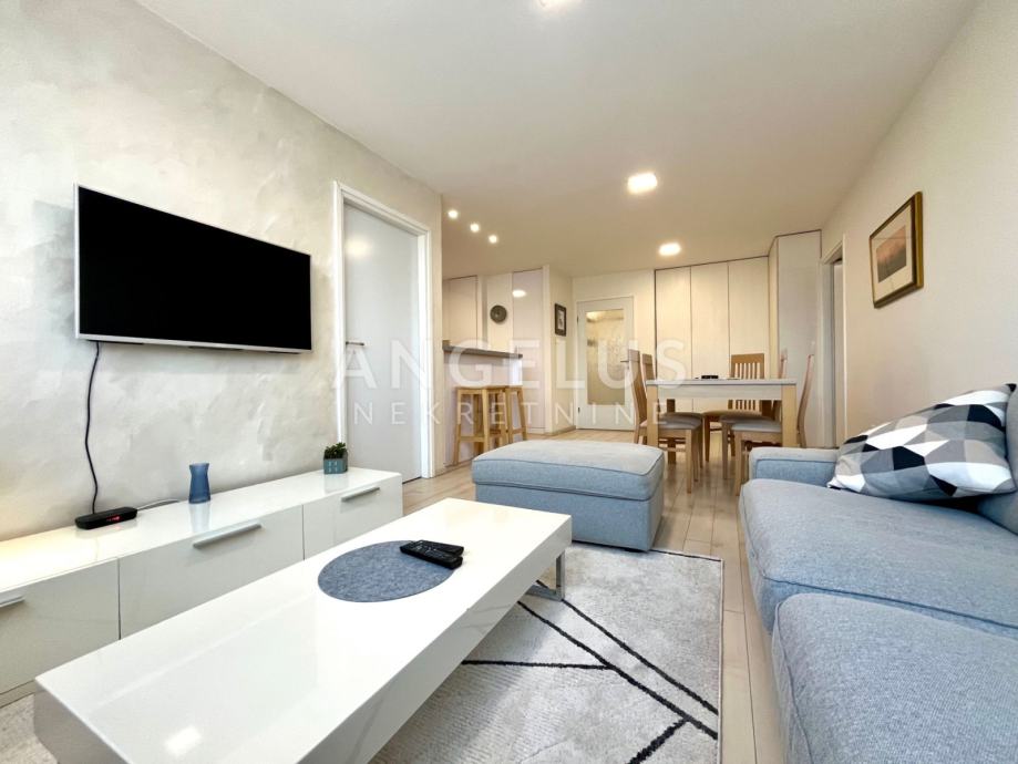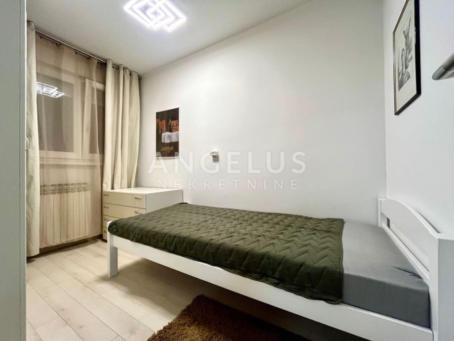 Moderan stan cca 60m2 jako lijepo organiziranog prostora i kompletno namješten, sastoji se od ulaznog hodnika, WC-a, kupaonice s kadom bez WC-a, jedne velike prostorije koja je orijentirana na zapad i u kojoj su smješteni kompletno opremljena i namještena kuhinja, blagovaonica i dnevni boravak, dvije spavaće sobe, nalazi se jedna veća koja ima izlaz na lođu i jedna manja dječja.