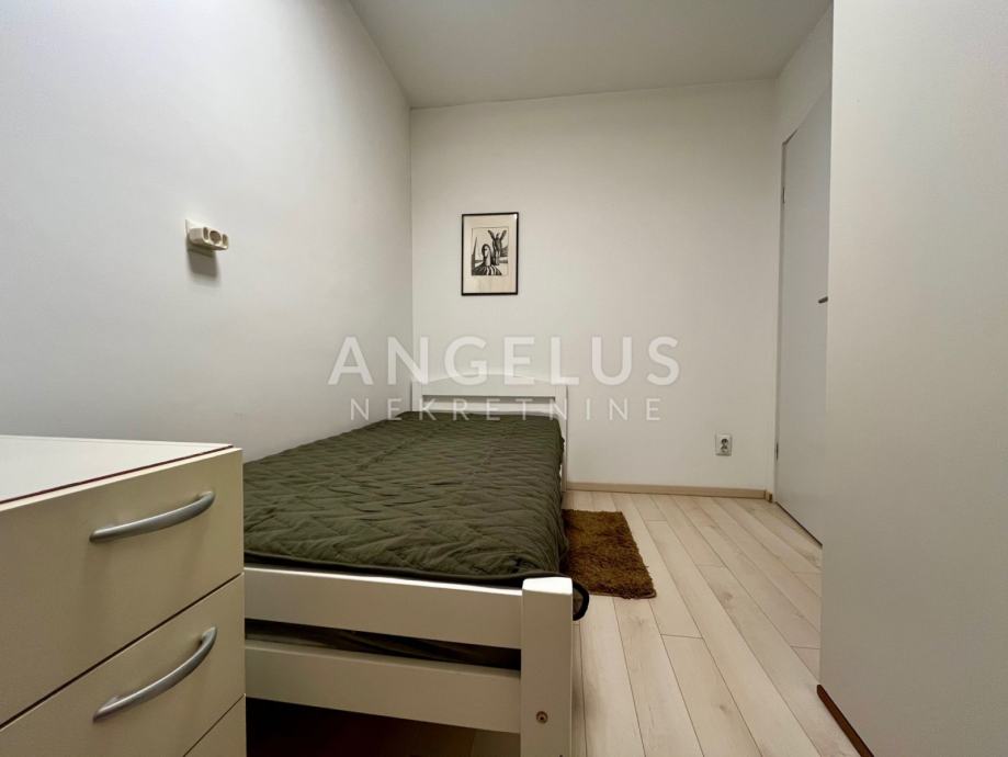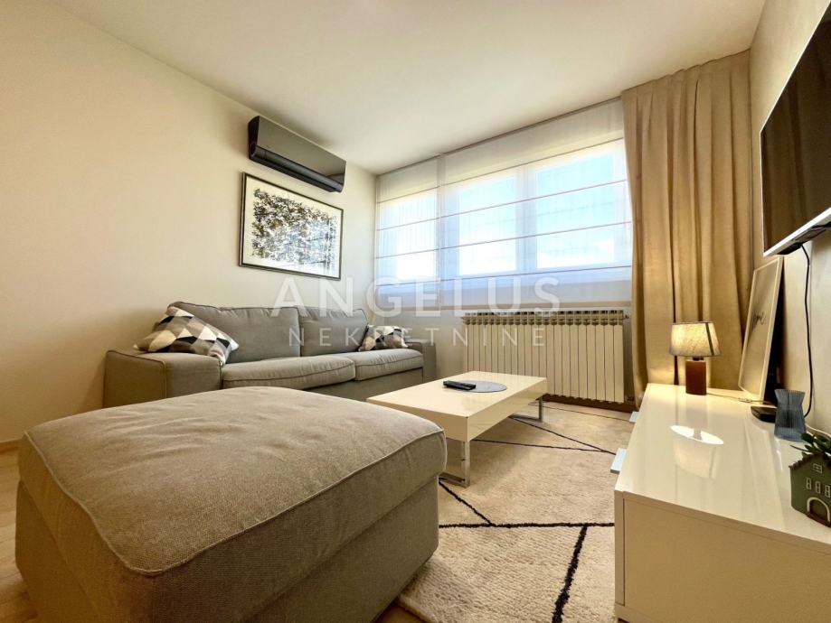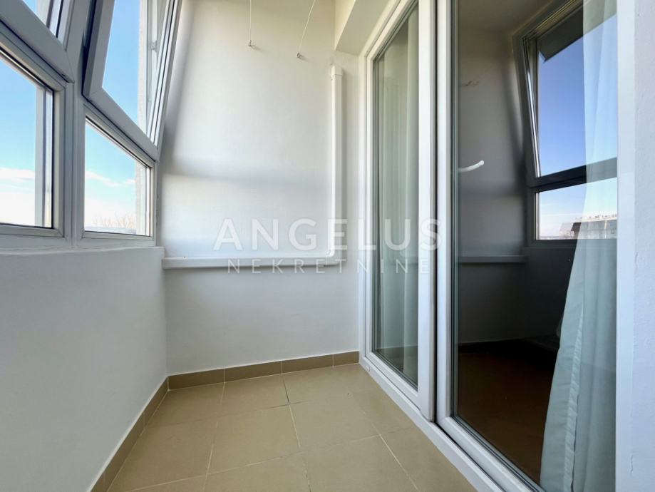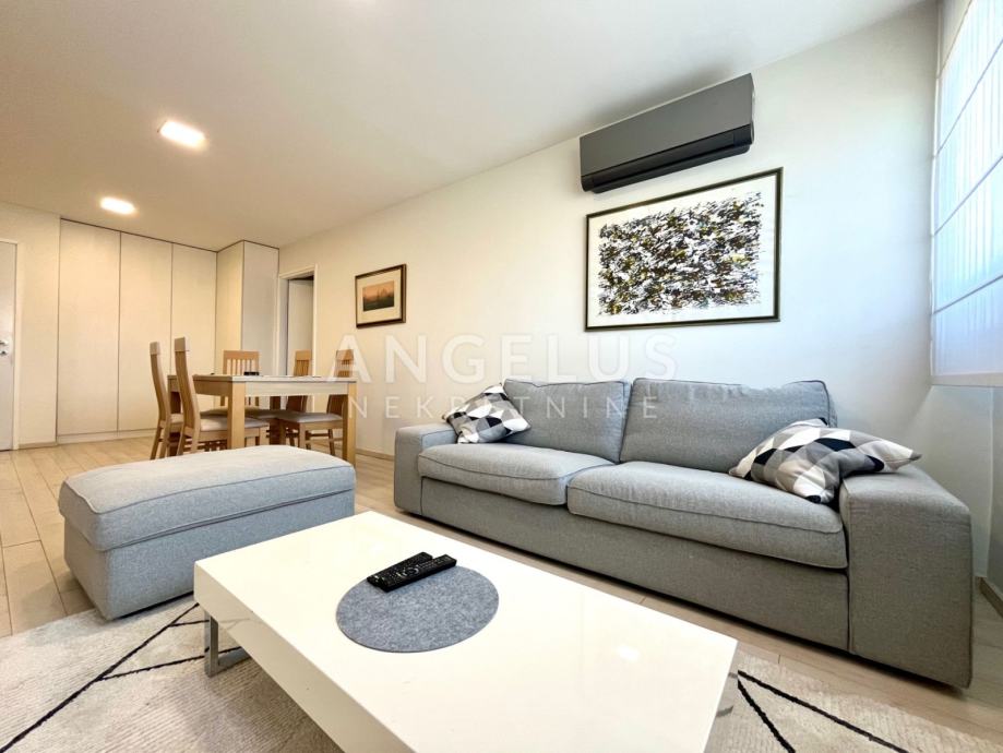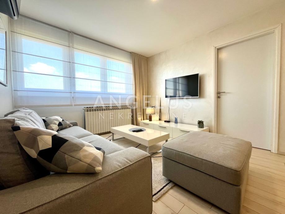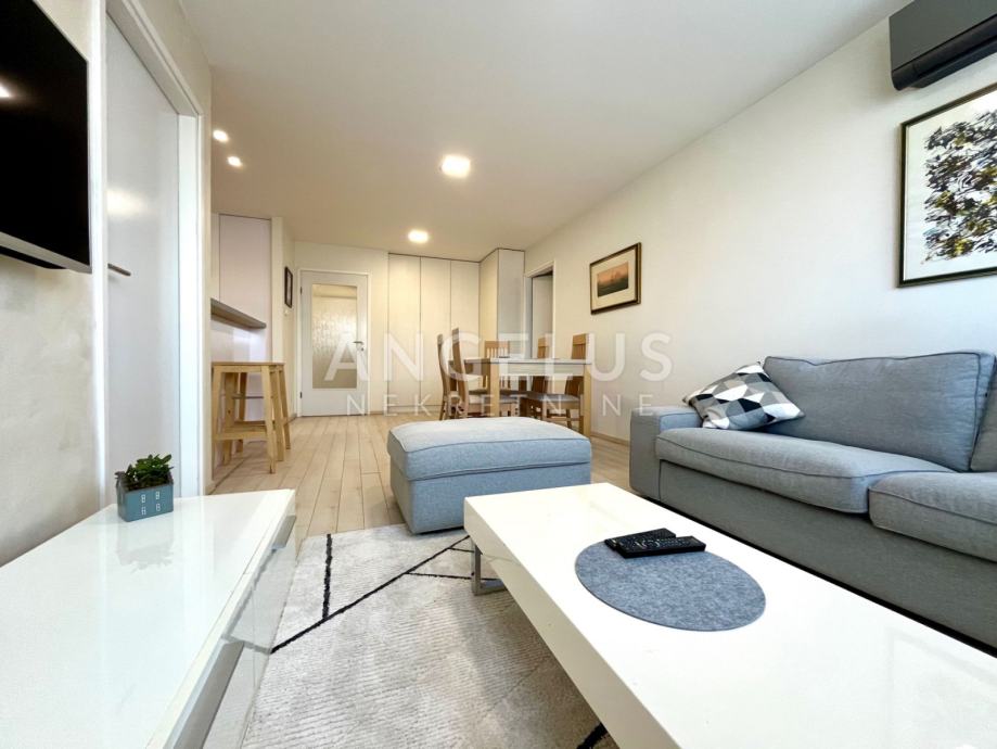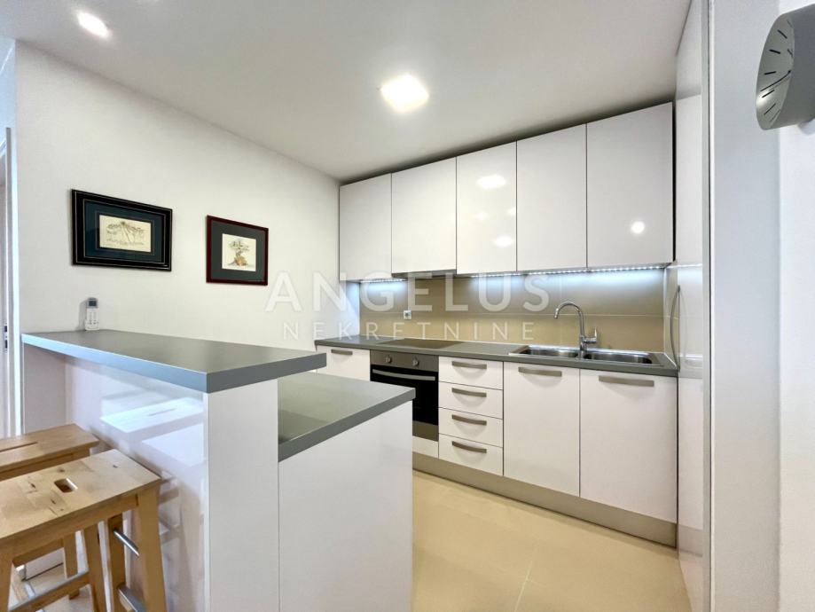 Moderan stan cca 60m2 jako lijepo organiziranog prostora i kompletno namješten, sastoji se od ulaznog hodnika, WC-a, kupaonice s kadom bez WC-a, jedne velike prostorije koja je orijentirana na zapad i u kojoj su smješteni kompletno opremljena i namještena kuhinja, blagovaonica i dnevni boravak, dvije spavaće sobe, nalazi se jedna veća koja ima izlaz na lođu i jedna manja dječja.
