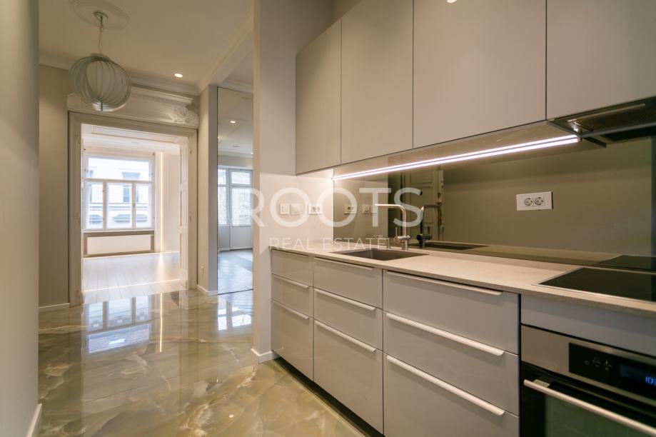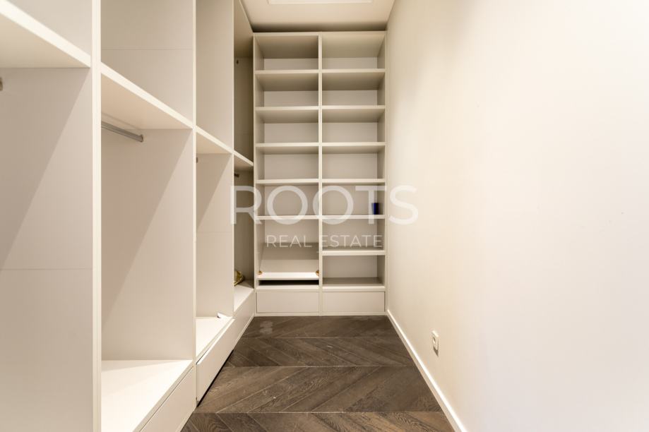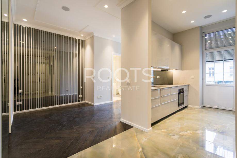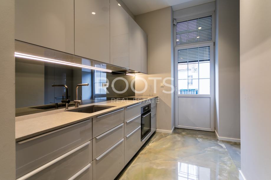 Stan je kompletno dizajnerski adaptiran, visoki stropovi, dekorativne štukature, ambijentalna LED rasvjeta, parket u uzorku riblje kosti i vrhunske keramičke obloge stvaraju dojam profinjenog građanskog stana s modernim luksuznim potpisom. Kuhinja je u potpunosti opremljena, a kroz stan se proteže velik broj ugradbenih ormara i spremišnog prostora.
