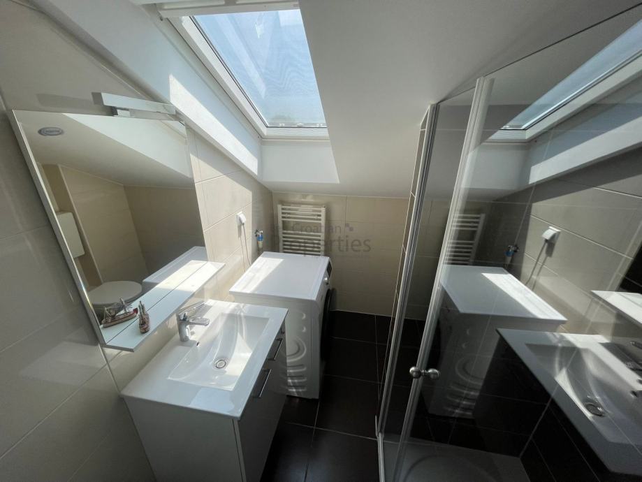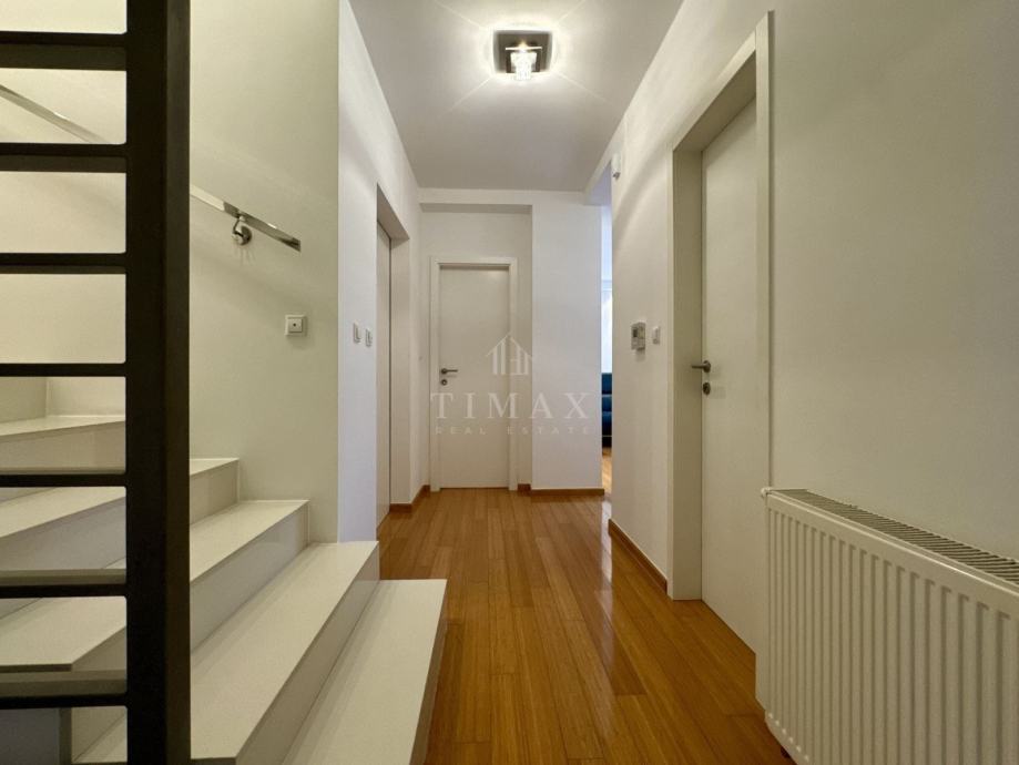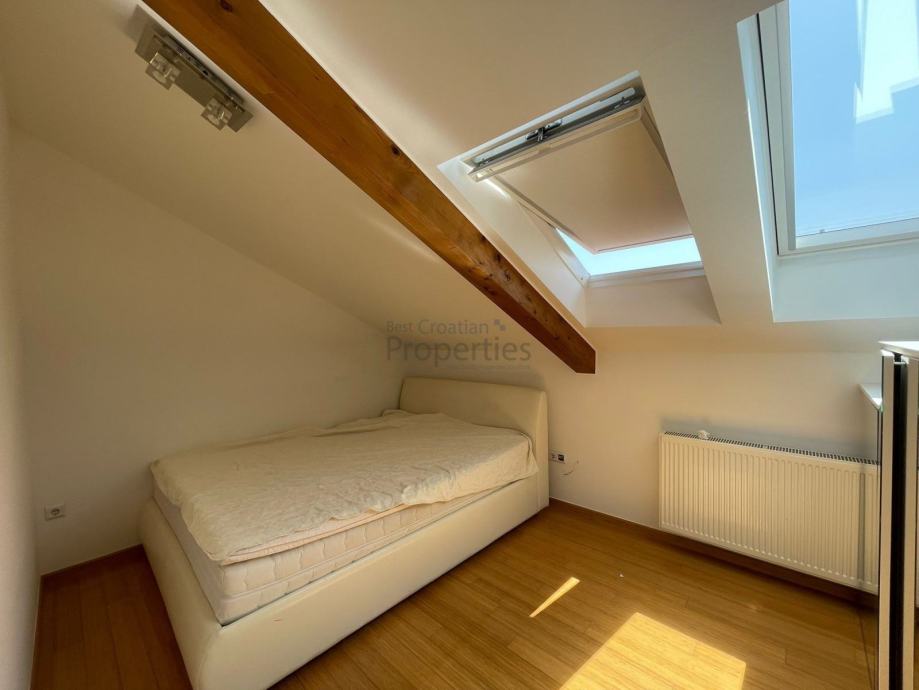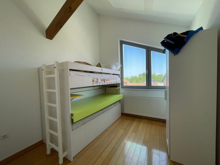 Odličan peterosoban stan novije gradnje u sklopu manje stambene zgrade sa samo četiri stambene jedinice na mirnoj lokacije u blizini svih potrebnih sadržaja. Stan se prostire na tri etaže (prizemlje + kat + visoko potkrovlje) i sa svojih četiri spavaće sobe, dva dnevna prostora za druženje, dvije kupaonice, dva walk-in ormara, vrtom sa vrtnom kućicom kao spremištem i dva vanjska parking mjesta čini idealan izbor višečlanu obitelj.