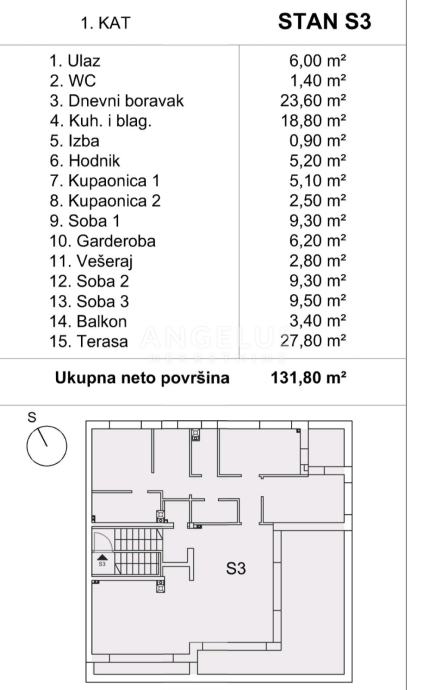 Stan je 101,76m2 a sa terasama 134,09m2 plus ostali pripadci (garaža, ostava i par. mjesto).