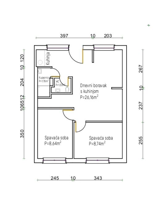 Stan se sastoji od poluotvorenog prostora u kojem se nalazi prostor za kuhinju i dnevni boravak, 2 zasebne spavaće sobe te kupaonice s tušem te zasebnog toaleta.