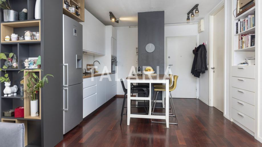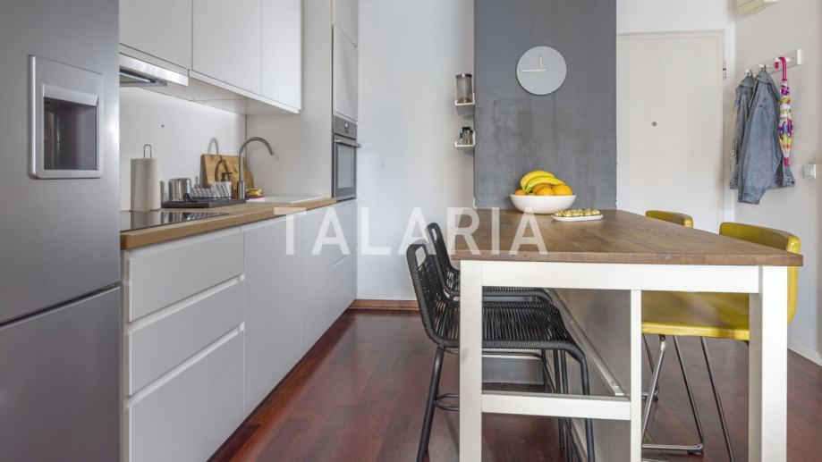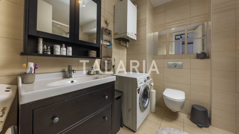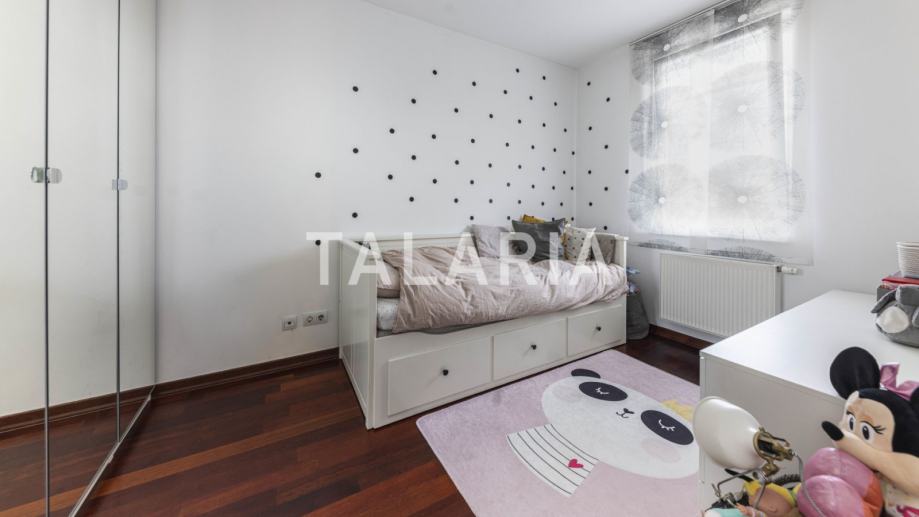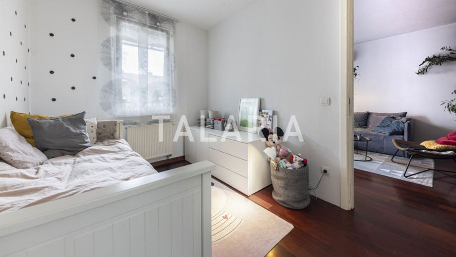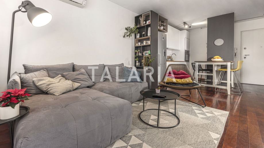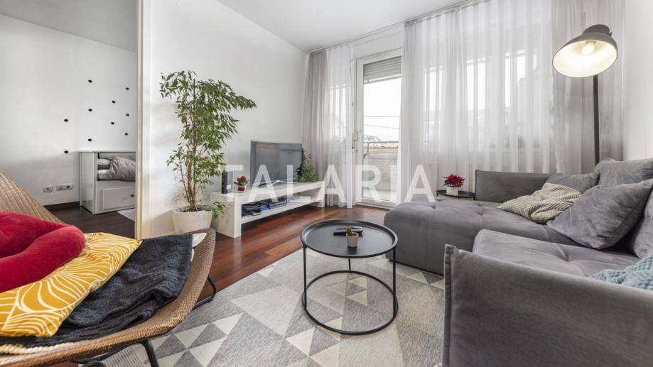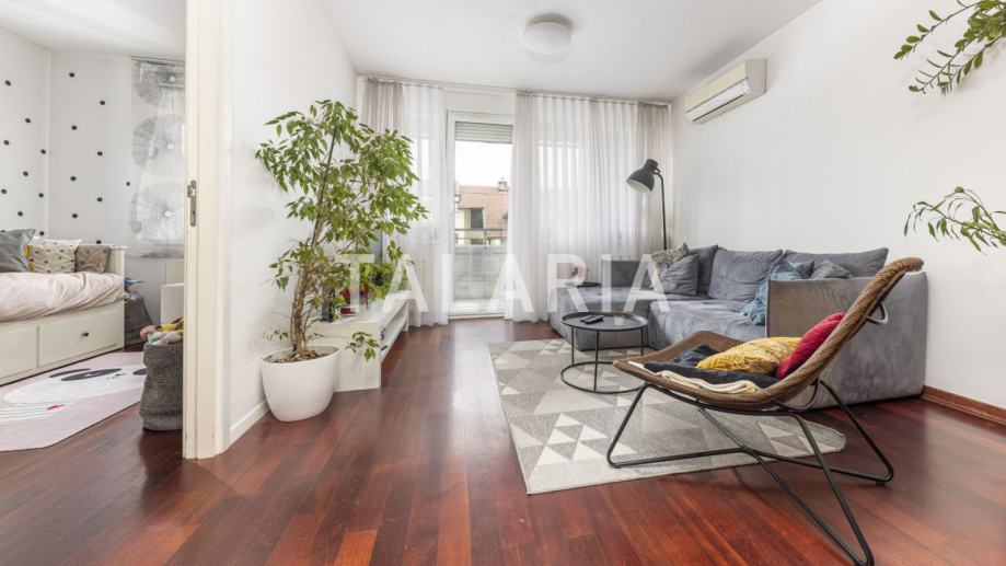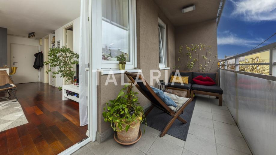 Genijalan, kompaktan, super iskorišten dvosoban stan na prvom katu dobro održavane zgrade s liftom u Hruševečkoj ulici. Zgradu je 2009. godine gradila Sigma, koja je u međuvremenu stekla ozbiljnu reputaciju. Stan se sastoji od prostrane kupaone s tuš kabinom, lijepe spavaće sobe s ugradbenim ormarima, te otvorenog tlocrta kuhinje, blagovaone i boravka koji se preko staklene stijene nastavlja na lijepu natkrivenu terasu. Orijentiran na mirnu stranu ulice gdje prometuju isključivo stanari koji se parkiraju u podzemnim garažama zgrade. Stan ima odličan tlocrt, bez izgubljenih kvadrata i svaka niša je super organizirana i iskorištena. Mogućnost najma garaže za dodatnih 100 EUR.