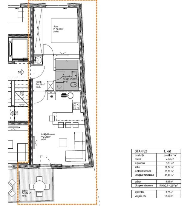 Stan S2 - trosoban stan na prvom katu, zatvorene površine 41,46 m2 s balkonom 5,94 m2, spremištem 3,73 m2 i vanjskim parkirnim mjestom.