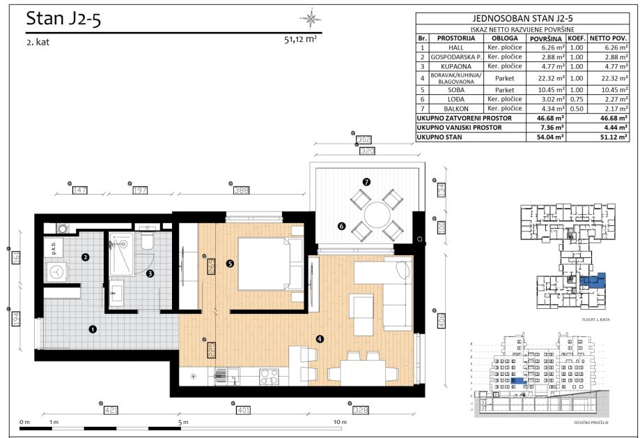 HERITAGE- Nova era stanovanja na TrešnjevciTrešnjevka, na atraktivnoj lokaciji gradi se zgrada s ukupno 110 stanova. Savršen spoj udobnosti i luksuza dostupan svima. Planirano useljenje- veljača 2027.Stan J2-5 dvosoban stan na prvom katu zatvorene površine 46,68 m2 i loggie 7,36 m2 (4,44)...