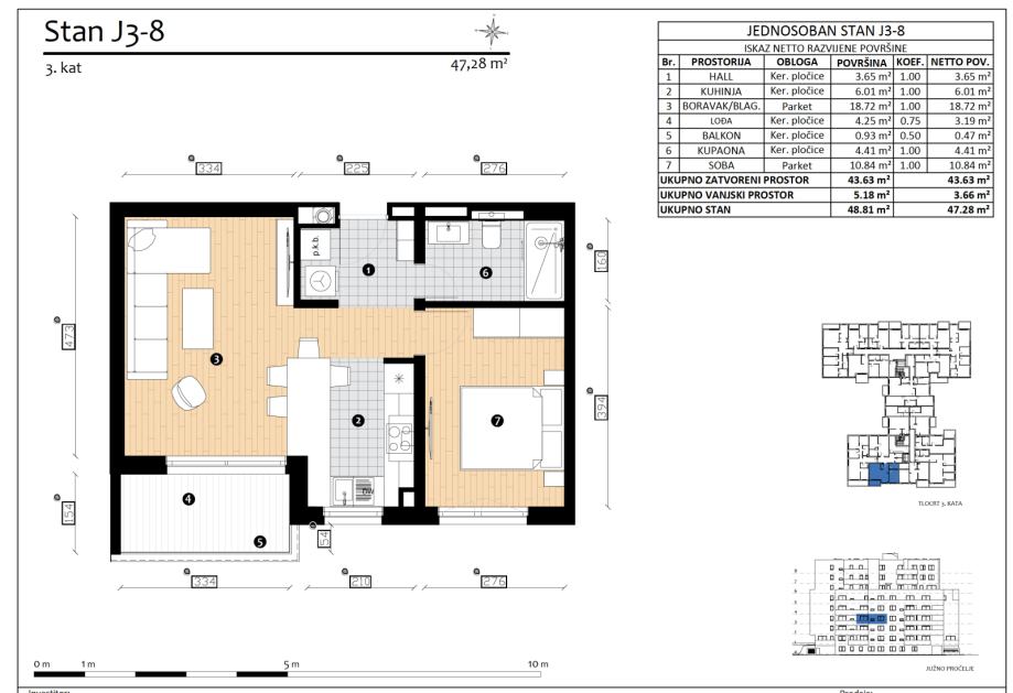 HERITAGE - new era of living in Trešnjevka Apartment J3-8two-room apartment on the third floor closed area 43.63 m2 loggia 4.25 ( 3.19 ) total calculation NKP 47.28 It consists of, entrance hall with laundry room, living room connected to dining room and kitchen, one bathroom, one large bedroom...