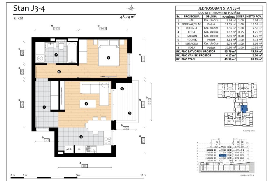 HERITAGE - New era of living in Trešnjevka Apartment J5-4 two-bedroom apartment on the third floor with a closed area of 45.79 m2, total calculation NKP 48.29 It consists of an entrance hall, a living room connected to the dining room and kitchen, one bathroom, one larger bedroom and a smaller...