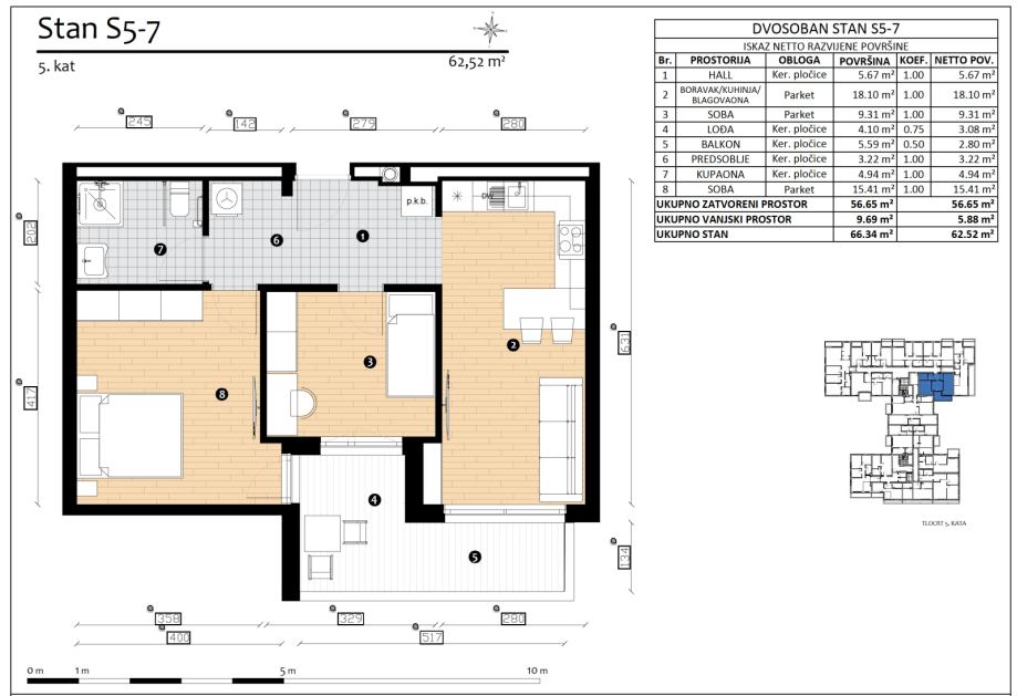 HERITAGE -Nova era stanovanja na TrešnjevciTrešnjevka, na atraktivnoj lokaciji gradi se zgrada s ukupno 110 stanova. Savršen spoj udobnosti i luksuza dostupan svima. Planirano useljenje- veljača 2027.Stan S5-7trosoban stan na petom katu zatvorene površine 56,65 m2 s balkonom 5.59 (2.80) ukupno...