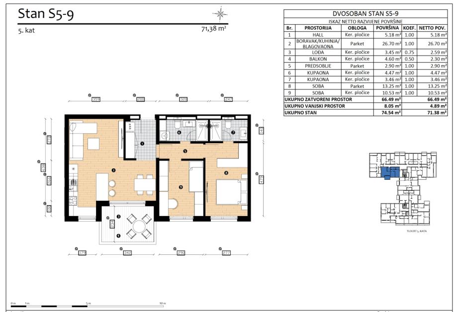 HERITAGE - Nova era stanovanja na TrešnjevciTrešnjevka, na atraktivnoj lokaciji gradi se zgrada s ukupno 110 stanova. Savršen spoj udobnosti i luksuza dostupan svima. Planirano useljenje veljača 2027.Stan S5-9 trosoban stan na petom katu zatvorene površine 66,49 m2 s balkonom 4.60 (2.30)...
