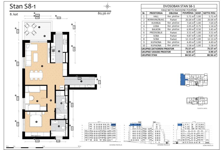 Trešnjevka, a building with a total of 110 apartments is being built in an attractive location. The perfect combination of comfort and luxury available to everyone. Planned move-in February 2027.Apartment S8-1 three-bedroom apartment on the eighth floor with a closed area of 75.57 m2 with a...