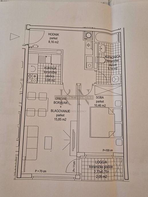 • Sadržaj: Spavaća soba, prostrana kupaonica, open space dnevni boravak s kuhinjom i blagovaonicom, izlaz na lođu, hodnik