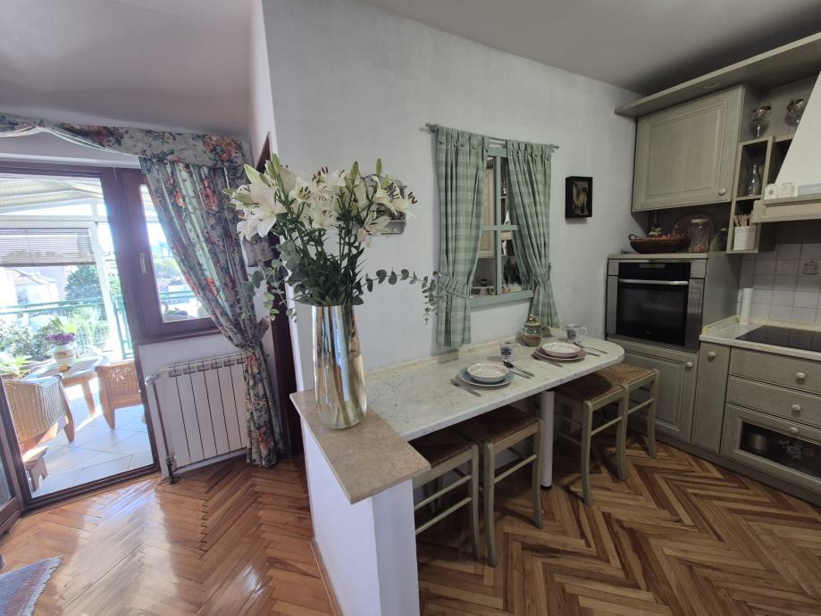 Stan površine 103m2 prostire se preko cjele etaže, a sastoji se od hodnika, kuhinje, blagovaone i dnevnog boravka s izlazom na loggiu, tri spavaće sobe te dvije kupaonice. Orijentacija istok-zapad. Stan je namješten i opremljen, spreman za useljenje.