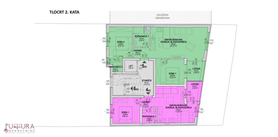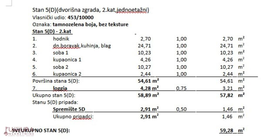 Sastoji se od: dvije spavaće sobe, dnevnog boravka + kuhinja + blagovaona, hodnika, dvije kupaonice i lođe.