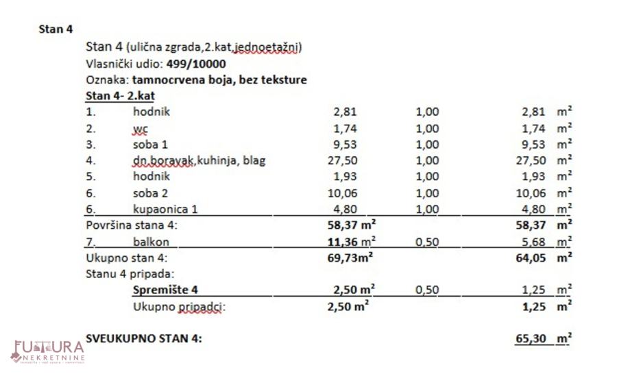 Sastoji se od: dvije spavaće sobe, dnevnog boravka + kuhinja + blagovaona, hodnika, kupaonice, wc-a i balkona.