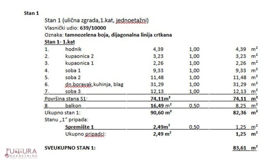 Sastoji se od: tri spavaće sobe, dnevnog boravka + kuhinja + blagovaona, hodnika, dvije kupaonice i balkon.
