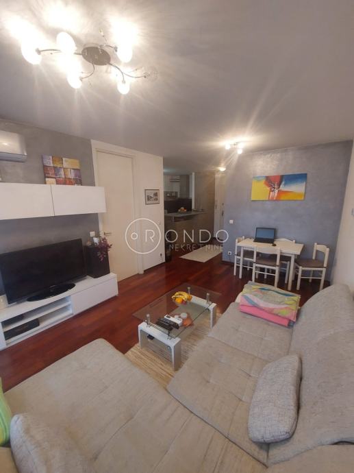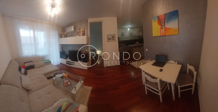 Stan nudi funkcionalan raspored s prostranom dnevnom sobom povezanoj s kuhinjom po mjeri i modernim šankom, koji pruža dodatni prostor za druženje i obiteljska okupljanja. Iz dnevnog boravka izlazi se na balkon, savršen za jutarnju kavu ili opuštanje nakon napornog dana.