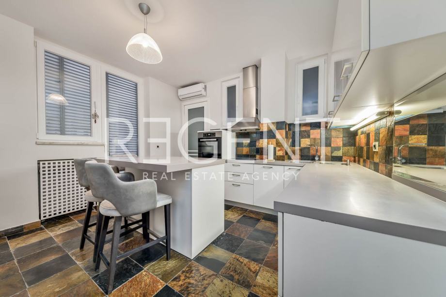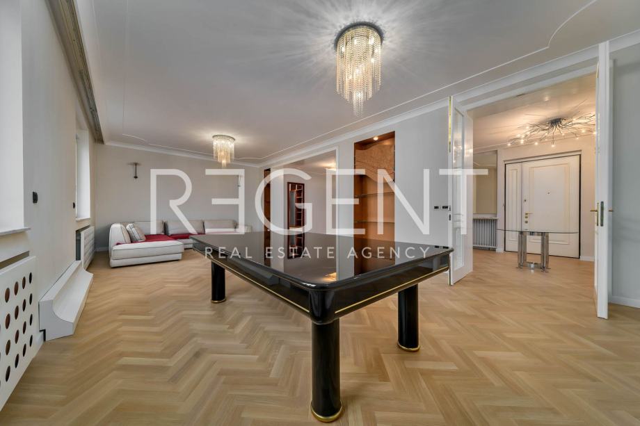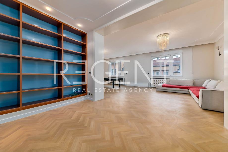 U samom srcu Zagreba, na Trgu bana Josipa Jelačića, smješten je prostrani četverosobni stan ukupne površine 160 m². Zbog svoje pozicije i rasporeda prostora, stan se može koristiti i kao reprezentativni poslovni prostor ili kao elegantan dom. Nalazi se na četvrtom katu jedne od najljepših zgrada na trgu s liftom, u izvrsnom stanju.Stan se sastoji od prozračnog dnevnog boravka povezanog s bibliotekom i blagovaonicom, velikog ulaznog predsoblja, dvije spavaće sobe, kuhinje te dvije kupaonice. Pripada mu i renovirano spremište od 6 m² u podrumu.Renoviran je s puno pažnje, ima visoke stropove i obilje prirodnog svjetla, što dodatno naglašava njegov šarm. Na raspolaganju je i mogućnost korištenja parkinga Pod zidom.Za sve dodatne informacije ili dogovor razgledavanja, slobodno nas kontaktirajte.Za više informacija, kontaktirajte našeg agenta na brojeve telefona:
