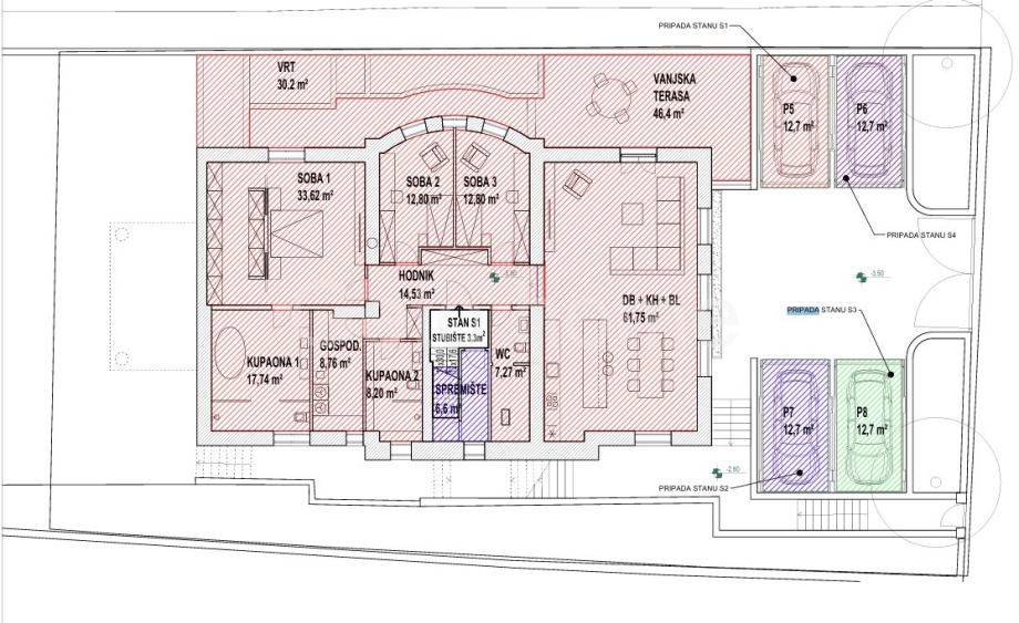 - vanjske nenatkrivene terase površine 46,40 m2.