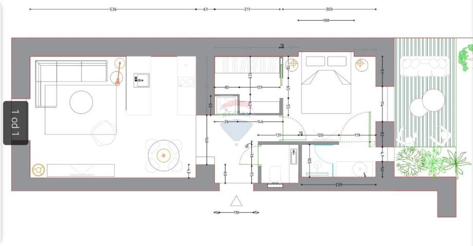 Predmetni stan sastoji se od ulaznog prostora s wc-om, kuhinje s blagovaonicom i dnevnim boravkom (open space) te spavaće sobe s kupaonicom i walk-in ormarom.