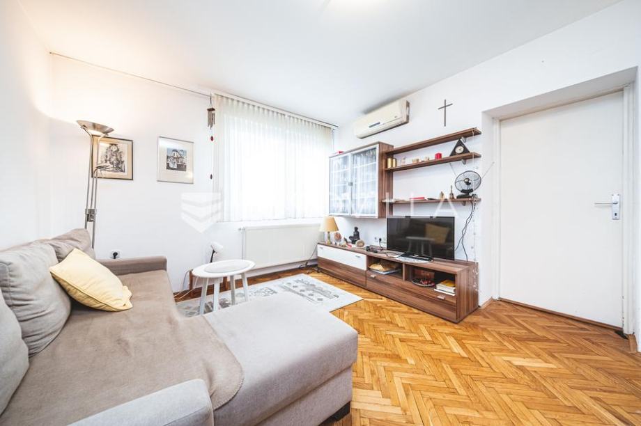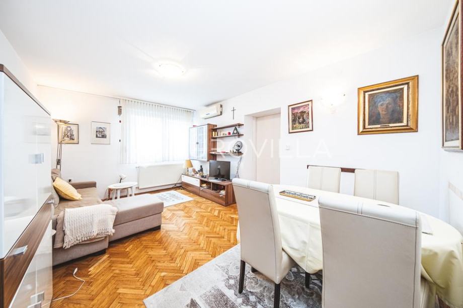 Zagreb, Volovčica, three-room apartment 58 m2 on the 1st floor of a residential building with an elevator from 1968. It consists of an entrance hall, a hall, two bedrooms, a kitchen, a living room with a dining room, a bathroom, an additional toilet and a storage room.Air-conditioned, north and...