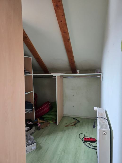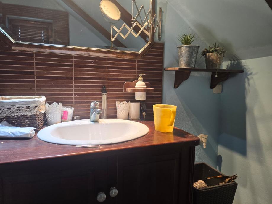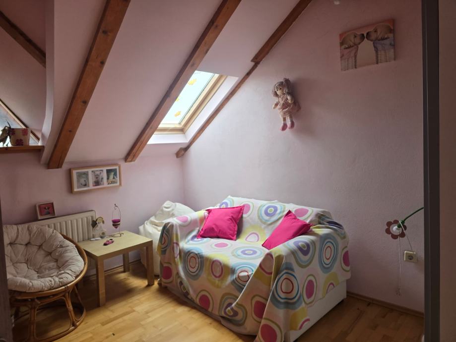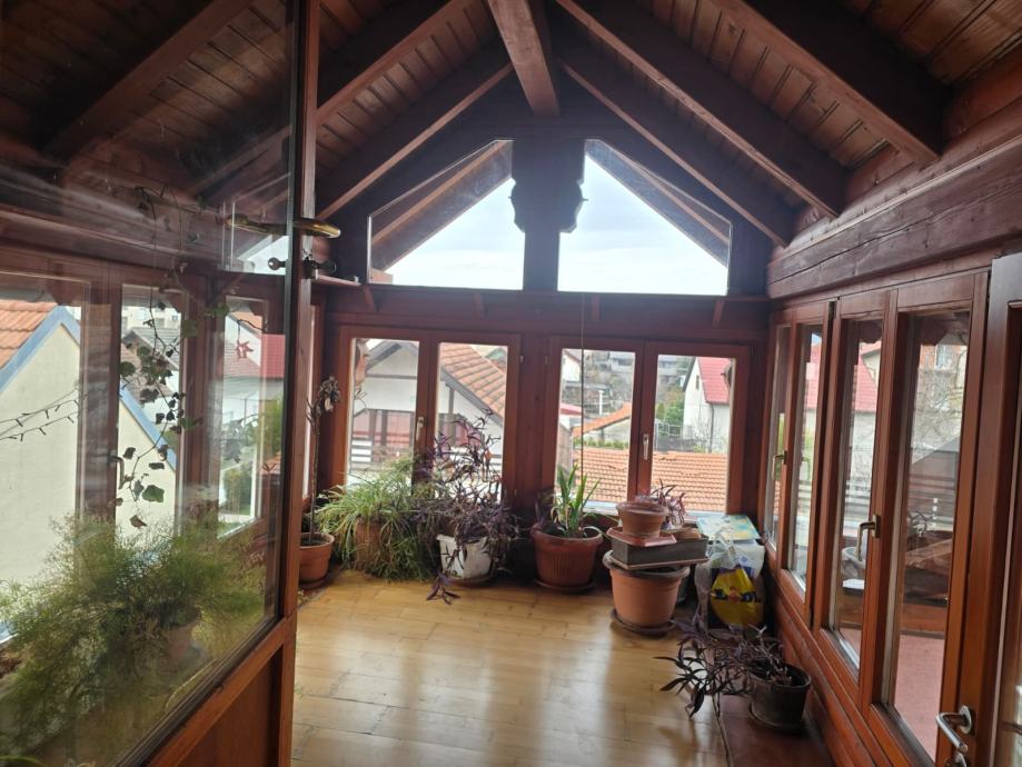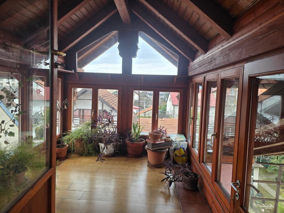 Prodaje se etažirani stan u obiteljskoj kući, na dobroj lokaciji i u blizini svih sadržaja (autobus, trgovina, škola, vrtić..). Stan zauzima 1.i 2.etažu kuće, a stubište koje vodi od ulaza do stana takođe pripada stanu. Stan se u donjoj etaži sastoji od prostranog predsoblja iz kojeg se ide stepenicama na 2.kat, manje kupaonice sa tušem, kuhinje sa blagovaonicom, prostranog dnevnog boravka, dvije spavaće sobe i terase na kojoj su stepenice na gornju etažu. Na gornjoj etaži se nalazi još jedan dnevni boravak s manjom kuhinjom), garderoba, dvije spavaće sobe, veće kupaonice sa kadom, zimski vrt koji niskim vratima ima izlaz na stubište prema donjoj etaži. Stanu pripada objekt u dvorištu, u naravi dvije garaže na čijem krovu je natkrivena terasa. S