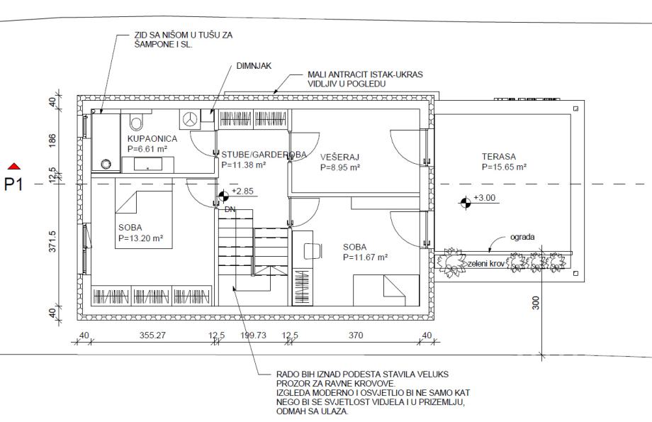 Površina zemljišta iznosi 297 m2, namjena je stambena (S), a vrijede urbana pravila 2.2. Ishođena je pravomoćna građevinska dozvola za gradnju katnice od 70 m2 tlocrtno, dakle 140 m2 bruto i 127 m2 neto (neto površina gornje etaže je manja zbog terase od 16 m2 koja se obračunava po koeficijentu 0,25).