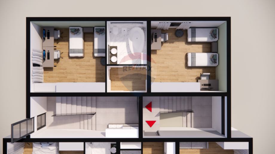 Penthouse je ukupne neto površine 220,07 m2 , a sastoji se od ulaznog prostora, dvije spavaće sobe i kupaone koje se nalaze na nižoj etaži, dok se na drugoj etaži nalazi dnevni boravak s kuhinjom i blagovaonom, vešeraj, ostava, toalet, radna soba, spavaća soba s vlastitom garderobom i kupaonom.
