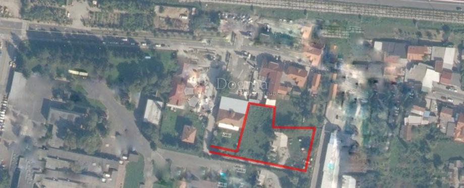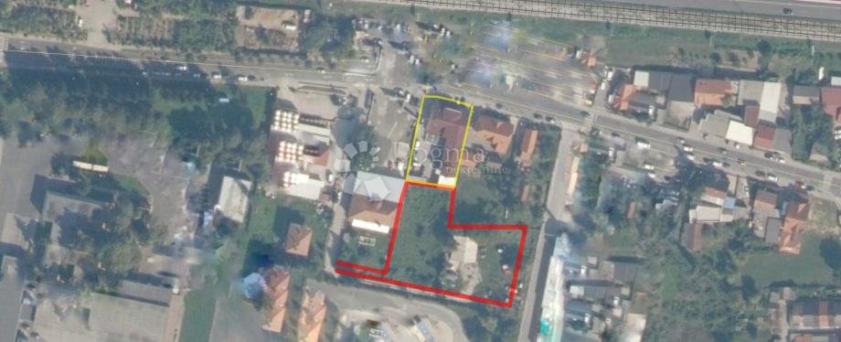 Uz navedeno građevinsko zemljište u prodaji je i poslovni objekt etažiranih različitih namjena (kefe bar, restoran, servis za motorna vozila, uredski prostor) ukupne površine više od 900 m2, na zemljištu od 1100 m2. (označeno žutom bojom).