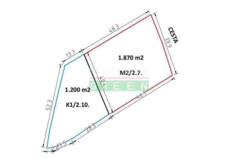 Građevinsko zemljište površine 3.070 m2 u zoni mješovite M2/2.7. i poslovne namjene K1/2.10. u mirnom dijelu naselja.