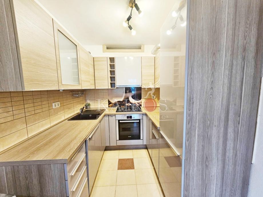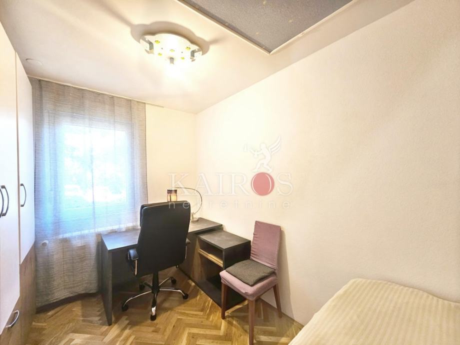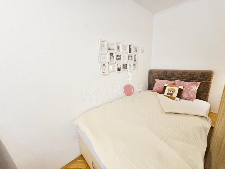 Stan se sastoji od dvije prostrane spavaće sobe, dnevnog boravka s djelomično odvojenom kuhinjom i blagovaonicom, te dva sanitarna čvora (kupaonica s WC-om i zaseban WC). Posebnu prednost čini velika lođa s garniturom za sjedenje - idealna za opuštanje. Stan je potpuno renoviran sa spuštenim plafonima i modernom LED rasvjetom.