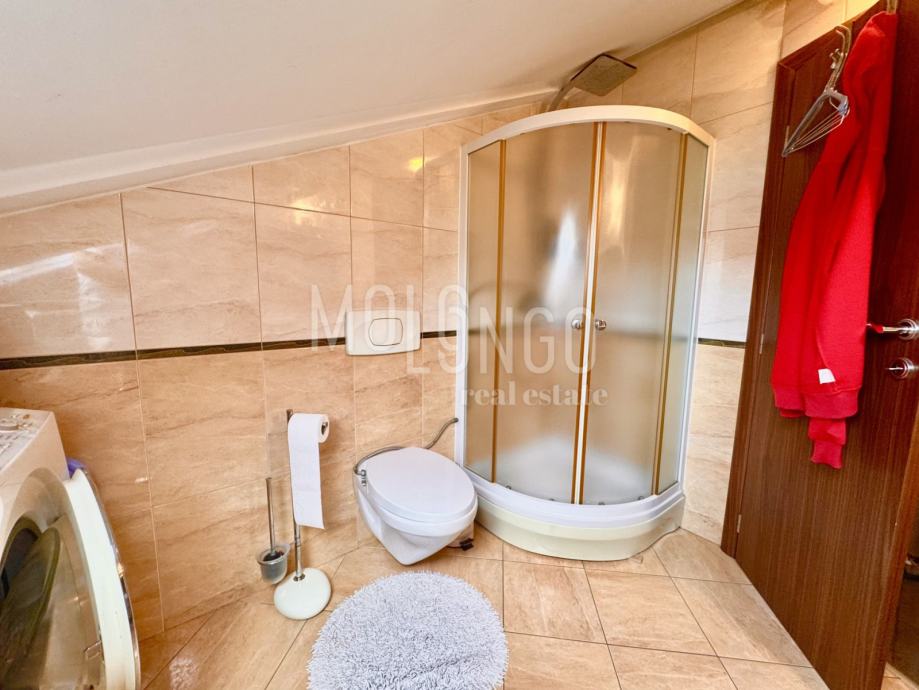 Na donjoj etaži nalazi se spavaća soba, kupaonica, kuhinja i dnevni boravak iz kojeg se izlazi na balkon s otvorenim pogledom na more, što dodatno doprinosi dojmu prozračnosti i ugode. Etaže su povezane kvalitetnim hrastovim stepenicama, a na gornjoj etaži nalaze se dvije dodatne spavaće sobe te prostorija koja se može koristiti kao ostava, manja radna soba ili garderoba, ovisno o potrebama budućih vlasnika.