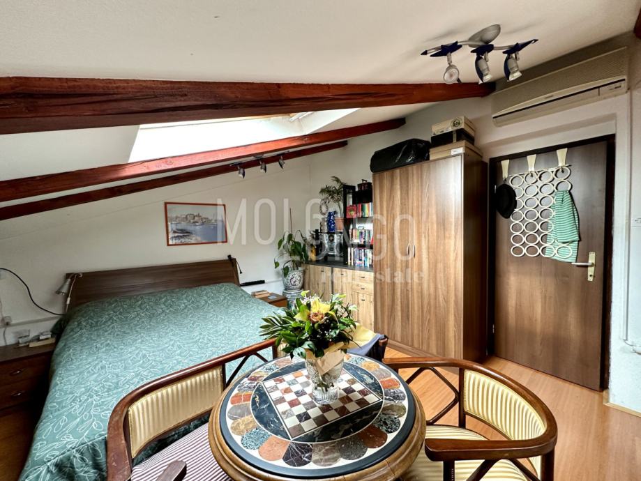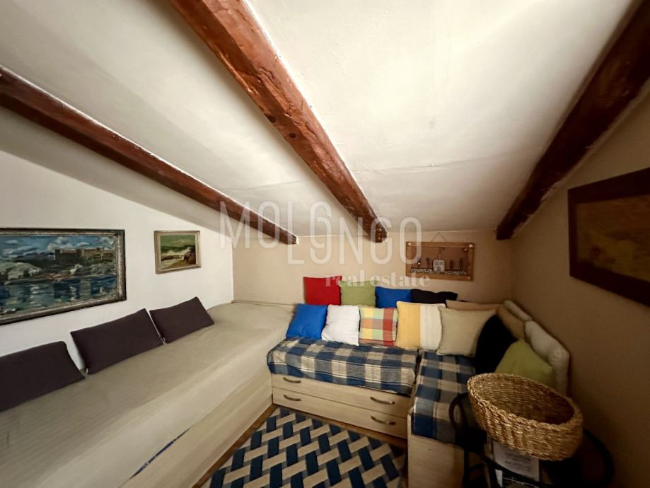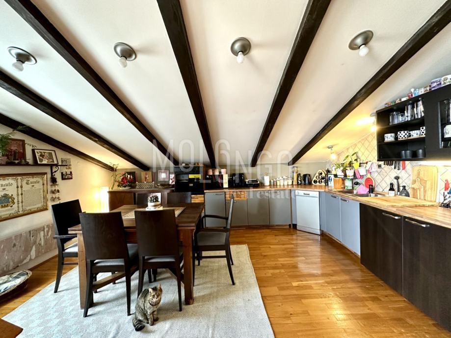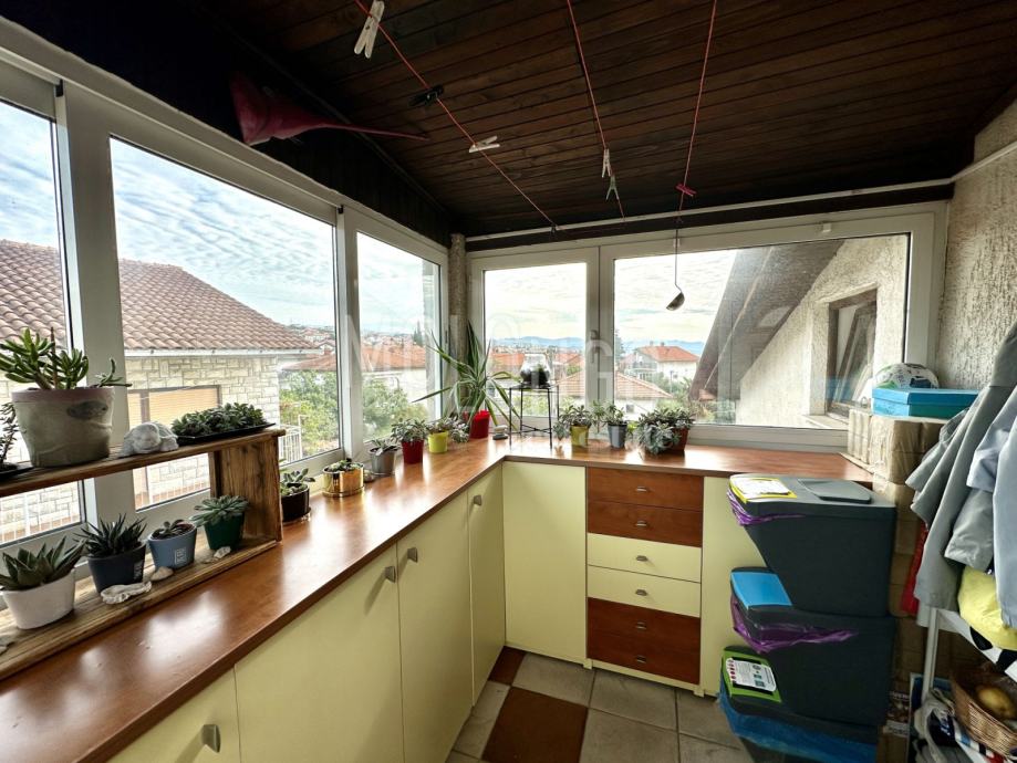 Unutrašnjost stana odlikuje se kvalitetnim parketom u dnevnom boravku, kuhinji i sobama, dok su kuhinja i namještaj rađeni po mjeri zbog kosina, što dodaje posebnu notu ovom prostoru.