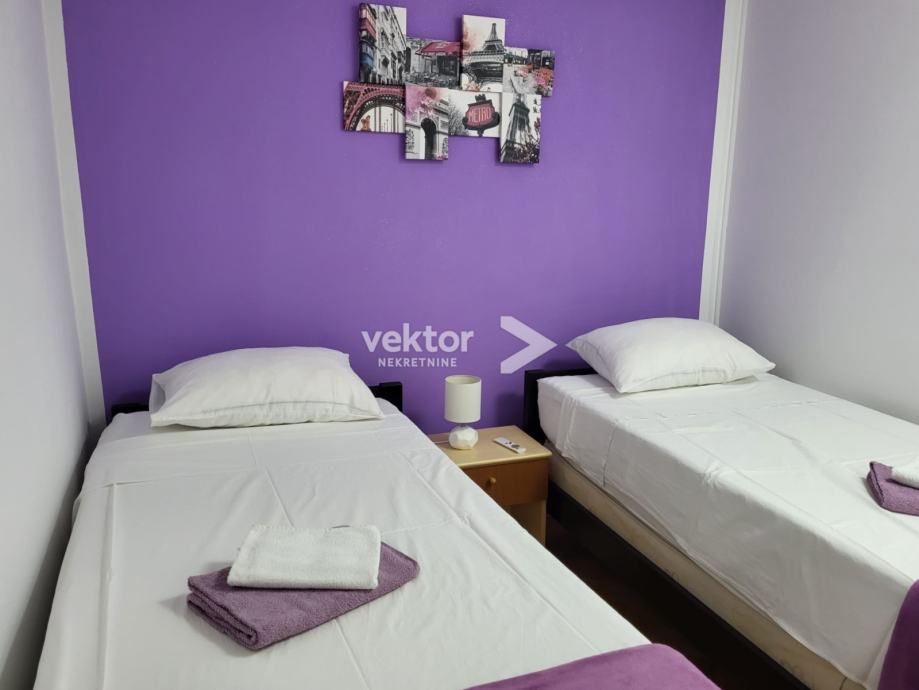 Stan ima odvojenu mini kuhinju, dnevni dio i sobu opremljenu sa dva kreveta.