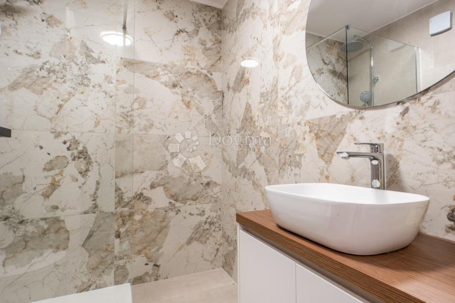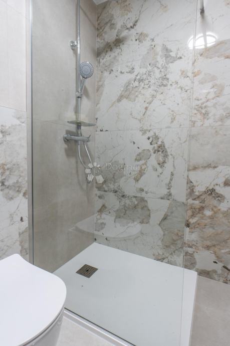 Kupaonica je moderno uređena,s visećim sanitarijama,ugradbenim vodokotlićem i novom keramikom.U hodniku je postavljena nova keramika ,dok je u kuhinji,dnevnom boravku i spavaćim sobama vodootporni laminat koji daje prostoru ugodnu toplinu.