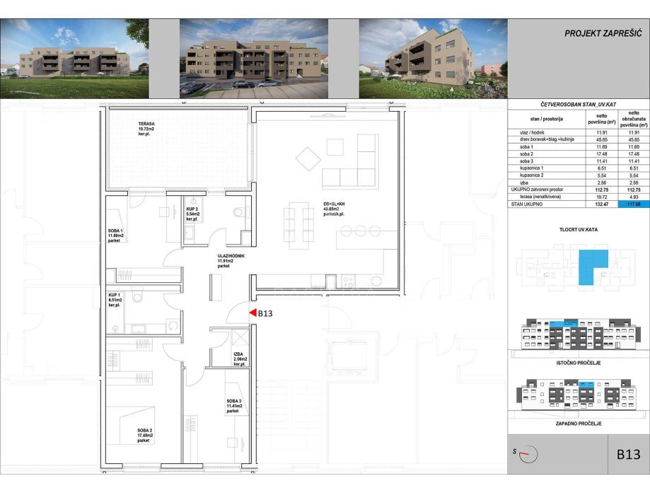 Stan oznake B13 - četverosoban, nalazi se na 3. katu te se sastoji od: ulaza, hodnika, dnevnog boravka sa kuhinjom i blagovaonicom, tri sobe, dvije kupaonice, izbe i terase. Ukupne površine 117,68 m2.