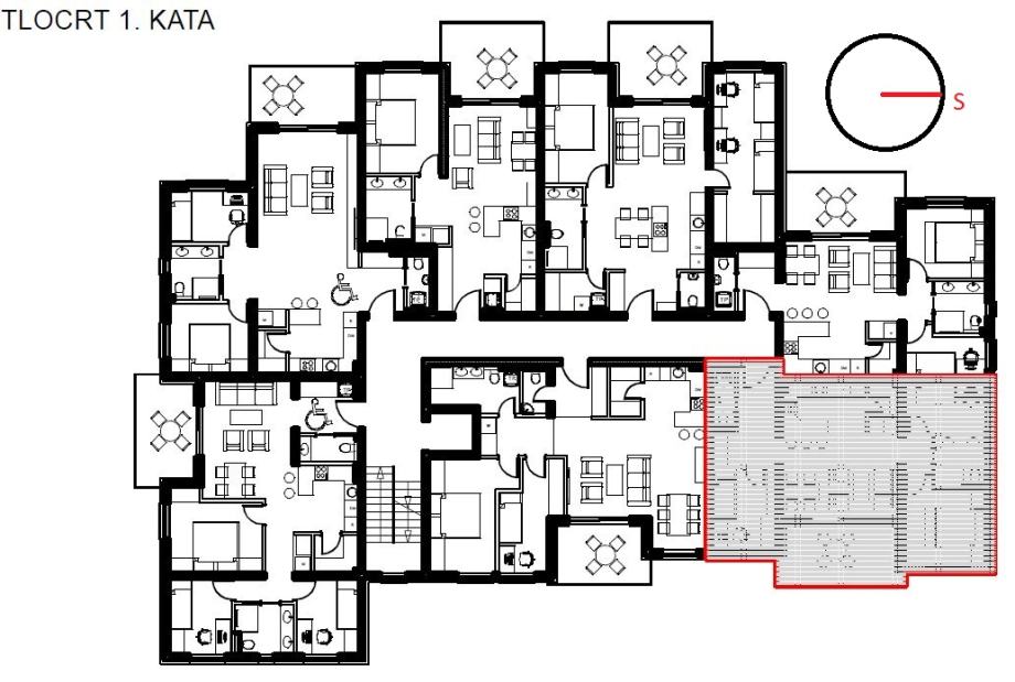 *sedam stanova na prvom katu od kojih jedan dvosoban, četiri trosobna te dva četverosobna stana.