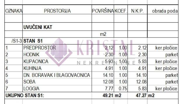 2-soban stan oznake S1-3 na 3.katu, ukupne neto prodajne površine 47.27 m2. Stan se sastoji od predprostor, hodnik, kupaonica, kuhinja, dnevni boravak+blagovaonica, spavaća soba, loggia 7.77 m2 (neto 5.83 m2).