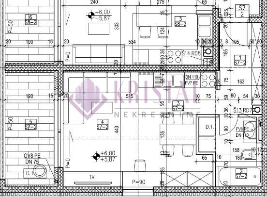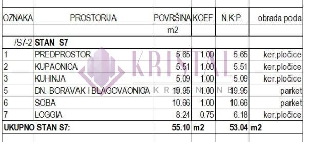 2-soban stan oznake S7-2 na 2.katu, ukupne neto prodajne površine 53.04 m2. Stan se sastoji od predprostor, kupaonica, kuhinja, dnevni boravak+blagovaonica, spavaća soba, loggia 8.24 m2 (neto 6.18 m2).