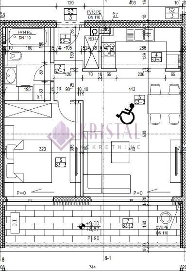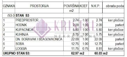 2-soban stan oznake S3-3 na 3.katu, ukupne neto prodajne površine 60.03 m2. Stan se sastoji od predprostor, hodnik, kupaonica, kuhinja, dnevni boravak+blagovaonica, spavaća soba, loggia 11.75 m2 (neto 8.81 m2).