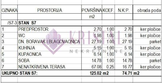 2-soban stan oznake S7-3 na 3.katu, ukupne neto prodajne površine 74.71 m2. Stan se sastoji od predprostor, wc, dnevni boravak+blagovaonica, kuhinja, kupaonica, spavaća soba, nenatkrivena terasa 67.08 m2 (neto 16.77 m2).