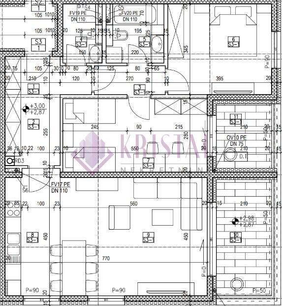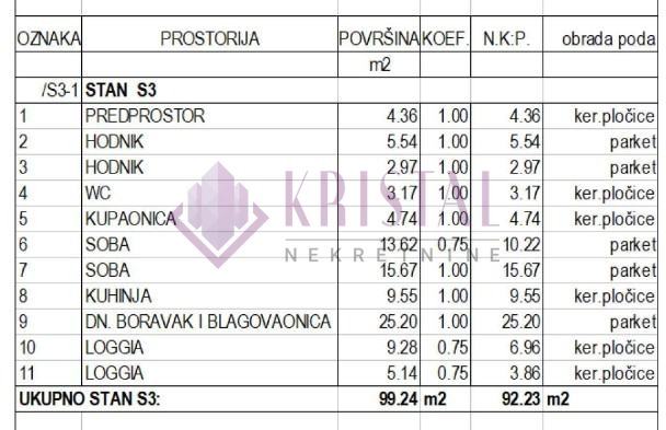 3-soban stan oznake S3-1 na 1.katu, ukupne neto prodajne površine 92.23 m2. Stan se sastoji od predprostor, hodnik, hodnik, wc, kupaonica, 2 spavaće sobe, kuhinja, dnevni boravak+blagovaonica, loggia 9.28 m2 (neto 6.96 m2), loggia 5.14 m2 (neto 3.86 m2).