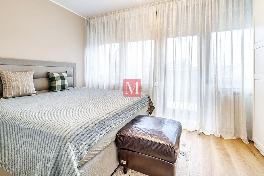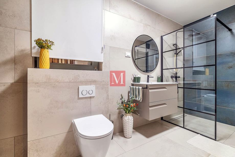 Prizemlje kuće obuhvaća prostranu garažu, funkcionalan vešeraj te dodatni toalet za goste. Na visokom prizemlju smješten je prostrani ulazni hodnik, elegantna kupaonica s modernom tuš kabinom i WC-om, kao i otvoreni koncept kuhinje, blagovaonice i dnevnog boravka, s izlazom na natkrivenu terasu te prostrana radna soba. Nakon visokog prizemlja je međukat na kojem je master spavaća soba sa velikim bakonom i garderoba.Na prvom katu nalaze se dvije dječje sobe i kupaonica sa tuš kabinom, te još jedan dnevni boravak i soba koja služi za odmaranje i dječju igru. Na tavanu je uređena knjižnica.