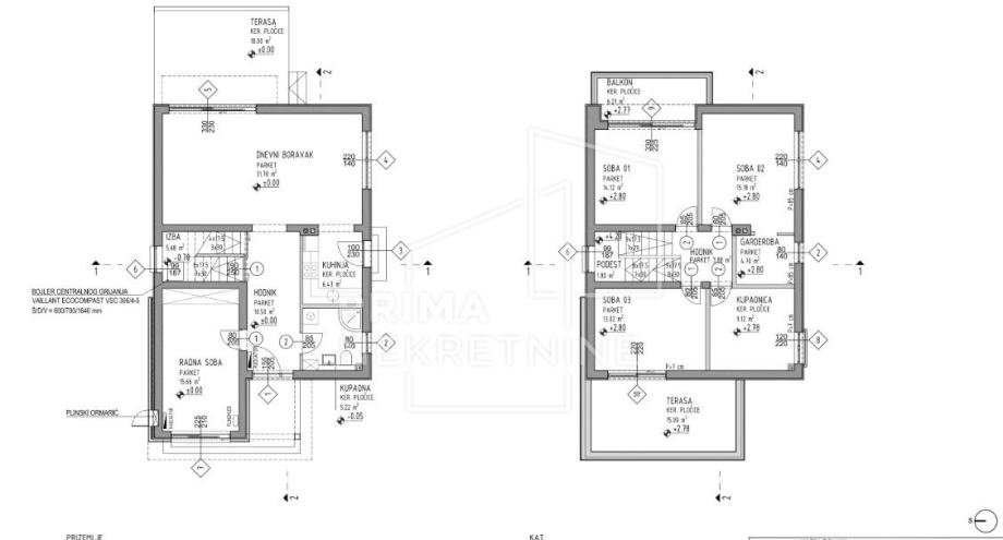 Grijanje: plinsko etažno, kondenzacijski bojler Vaillant, radijatori Vogel & Noot.