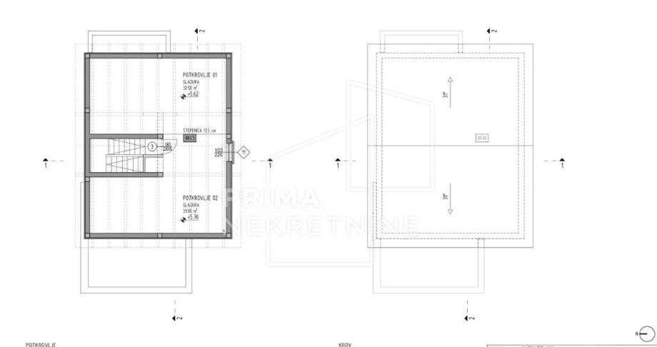 Potkrovlje je nestambeni prostor s dovedenim priključcima, visina sljemena je 2.80, dok je najniža uspravna ploha zida 1.20 m.