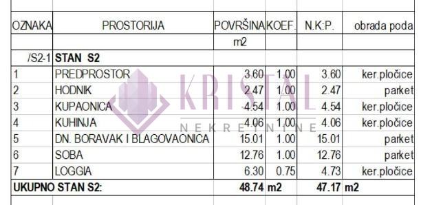2-soban stan oznake S2-1 na 1.katu, ukupne neto prodajne površine 47.17 m2. Stan se sastoji od predprostor, hodnik, kupaonica, kuhinja, dnevni boravak+blagovaonica, spavaća soba, loggia 6.30 m2 (neto 4.73 m2).